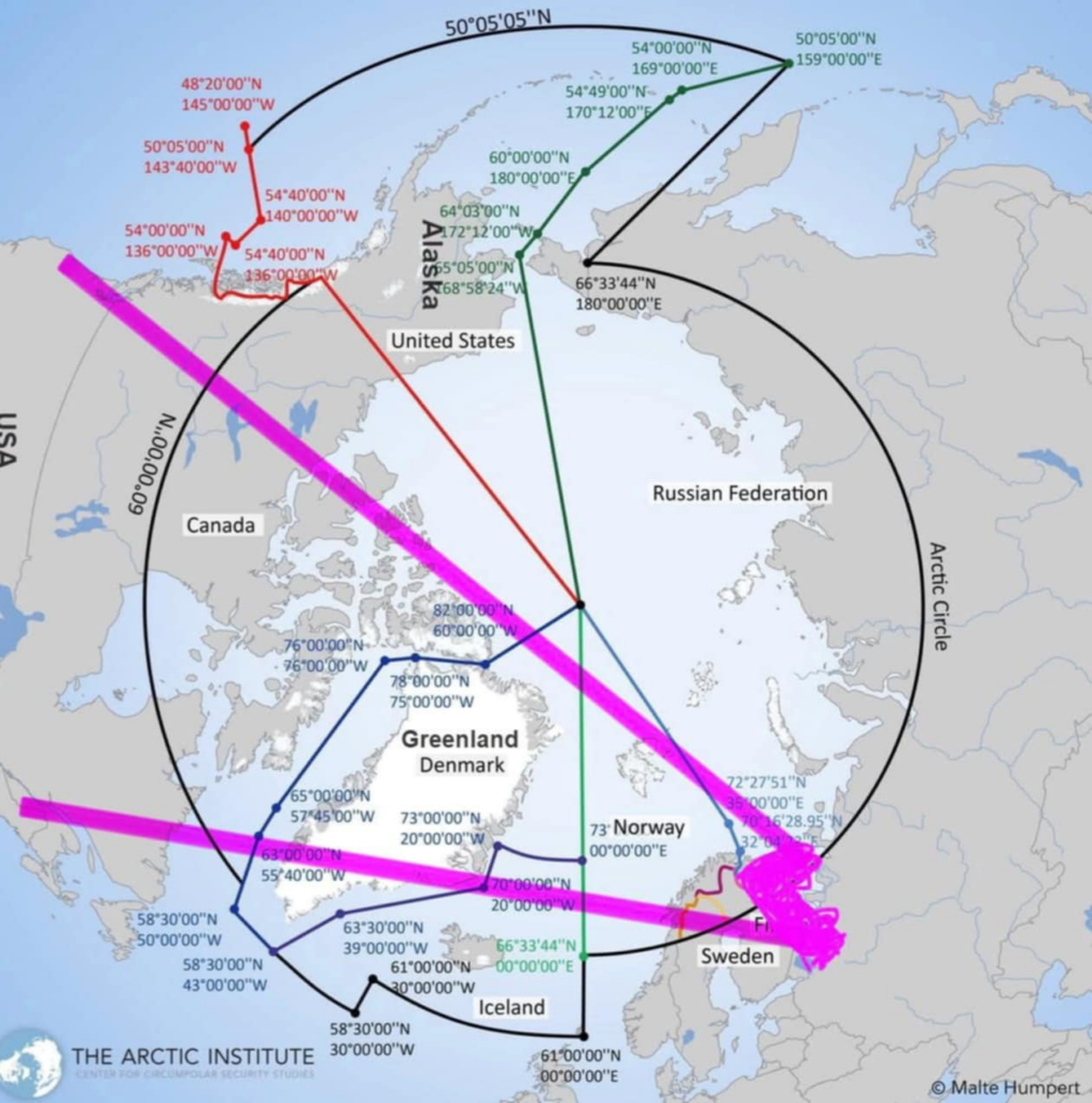 Nëse shikon trajektoren e fluturimit (balistike ose me shtytje) nga Gadishulli Kola drejt cilitdo vend në 48 shtetet kontinentale të SHBA-së — trajektore që ndodhet midis dy vijave rozë — gjithçka kalon mbi Groenlandë.