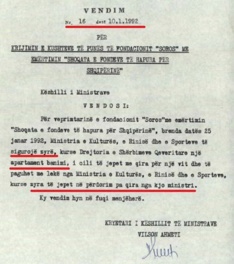 Bëhet fjalë për Vendimin e Këshillit të Ministrave nr. 16, datë 10.01.1992, dokumenti i parë zyrtar në Republikën e Shqipërisë që rregullon krijimin e kushteve të punës për Fondacionin “Soros”, me emërtimin “Shoqata e Fondeve të Hapura për Shqipërinë”.