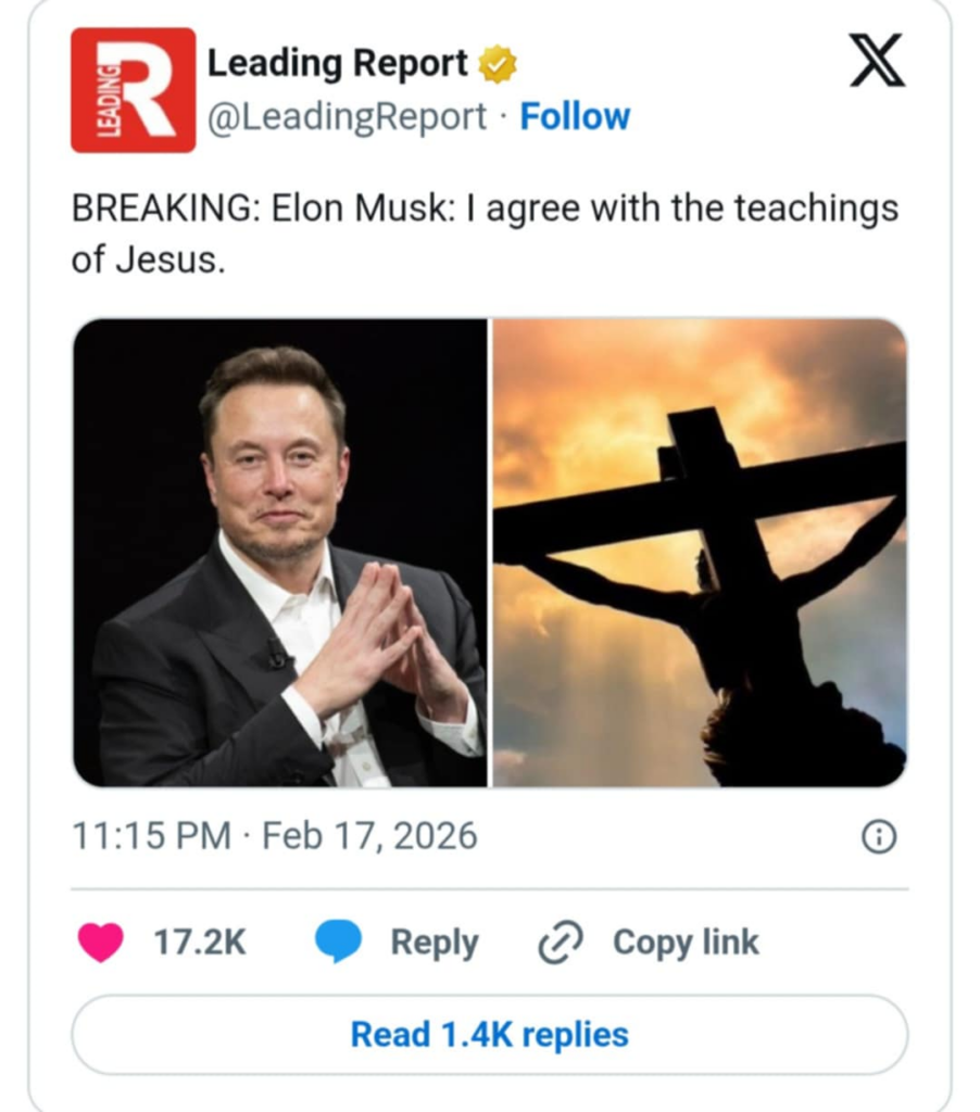Më 17 shkurt 2026, Musk iu përgjigj një përdoruesi të X-it që sugjeronte se dikush duhej “të çonte Elon Musk te Krishti”. Në përgjigjen e tij, Musk shkroi: